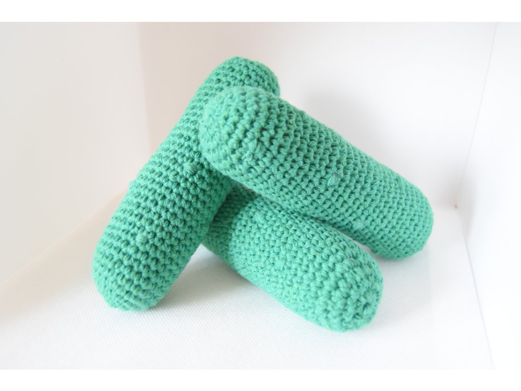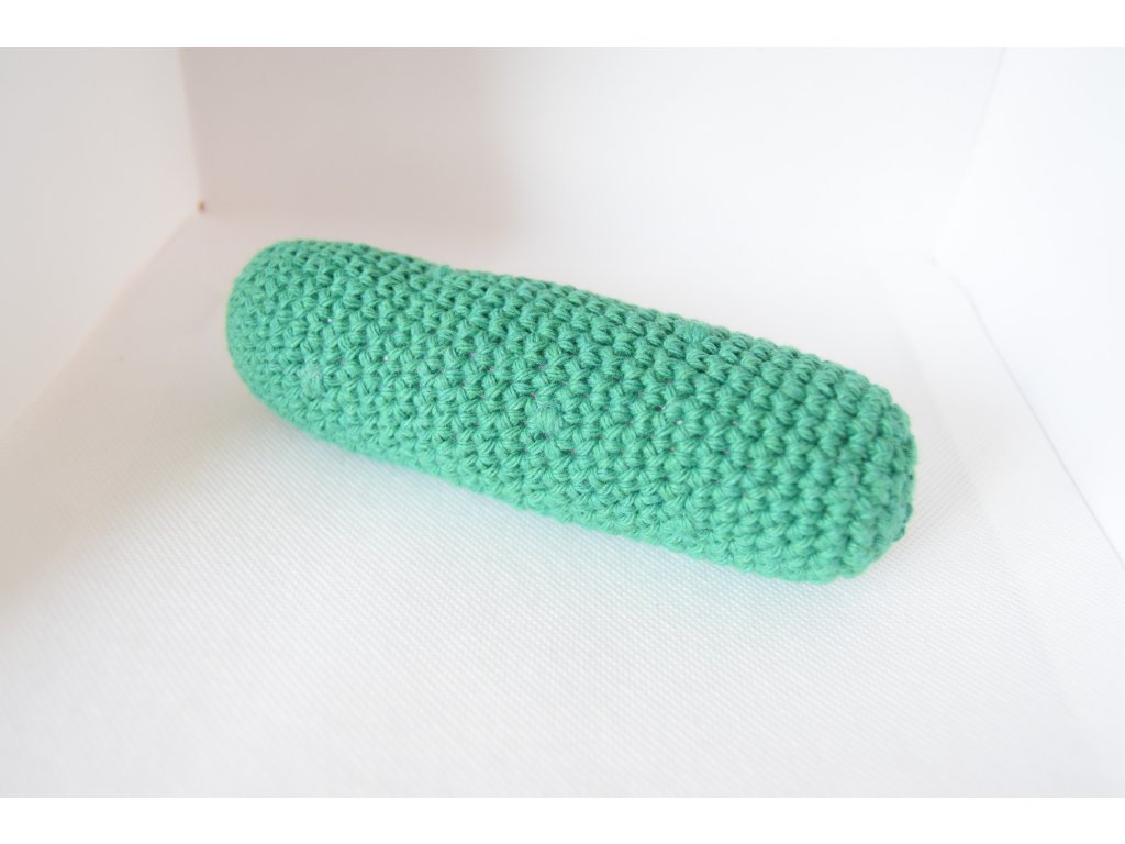 Tahle háčkovaná okurka je celá zelená a hrdě posetá drobnými uzlíky, které připomínají její skutečné, lehce pichlavé sestřenice ze zahrádky. Dlouhá tak akorát, měkoučká, ale s výrazem „já jsem ta křupavá“ – i když nekřupe ani trochu. Neutíká z krabičky, nepouští vodu a nikdy nezměkne ve špatném smyslu slova. Okurka, kterou můžeš mačkat, muchlat i nosit na piknik – bez chleba a octa, zato se spoustou úsměvů.